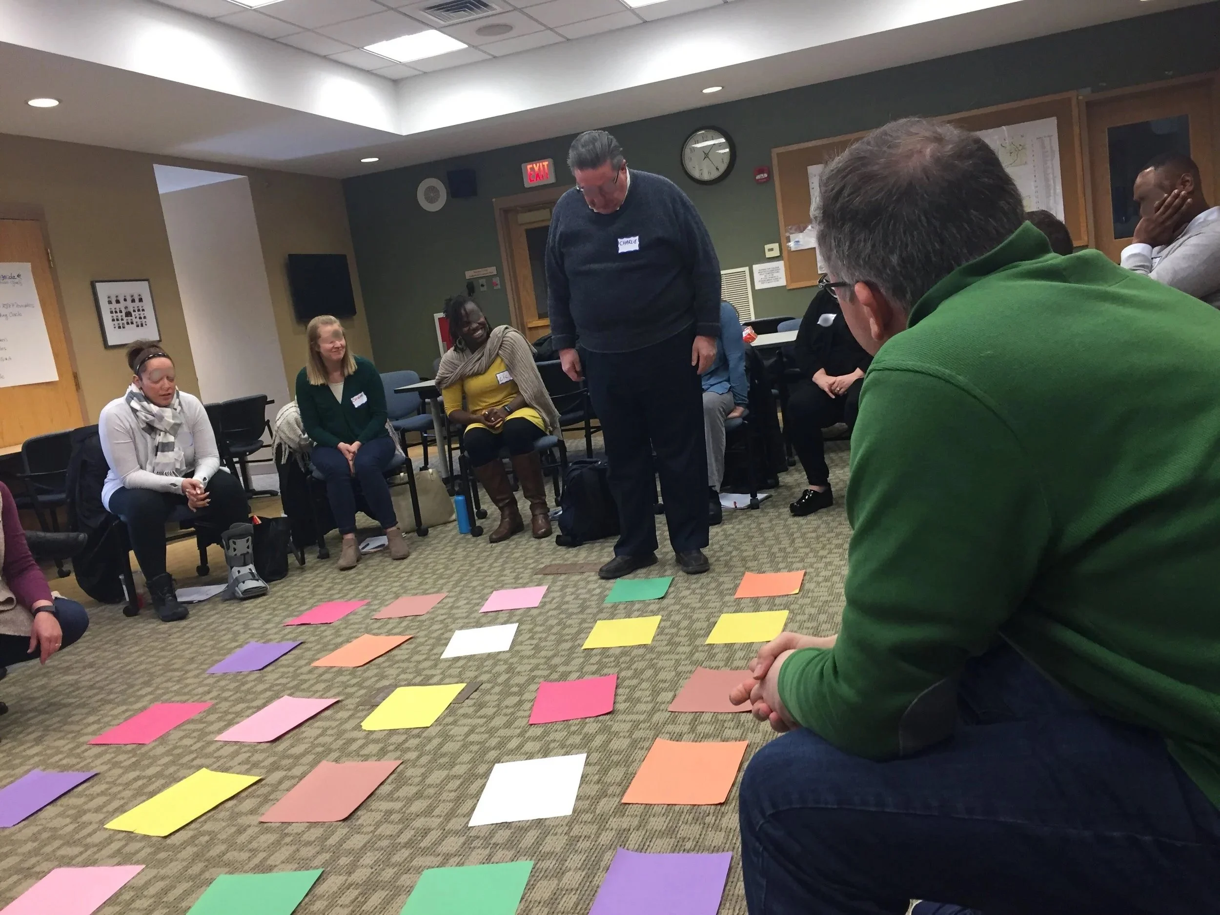 Group of people seated in a circle in a room, participating in a workshop or team-building activity, with colored papers arranged on the floor.