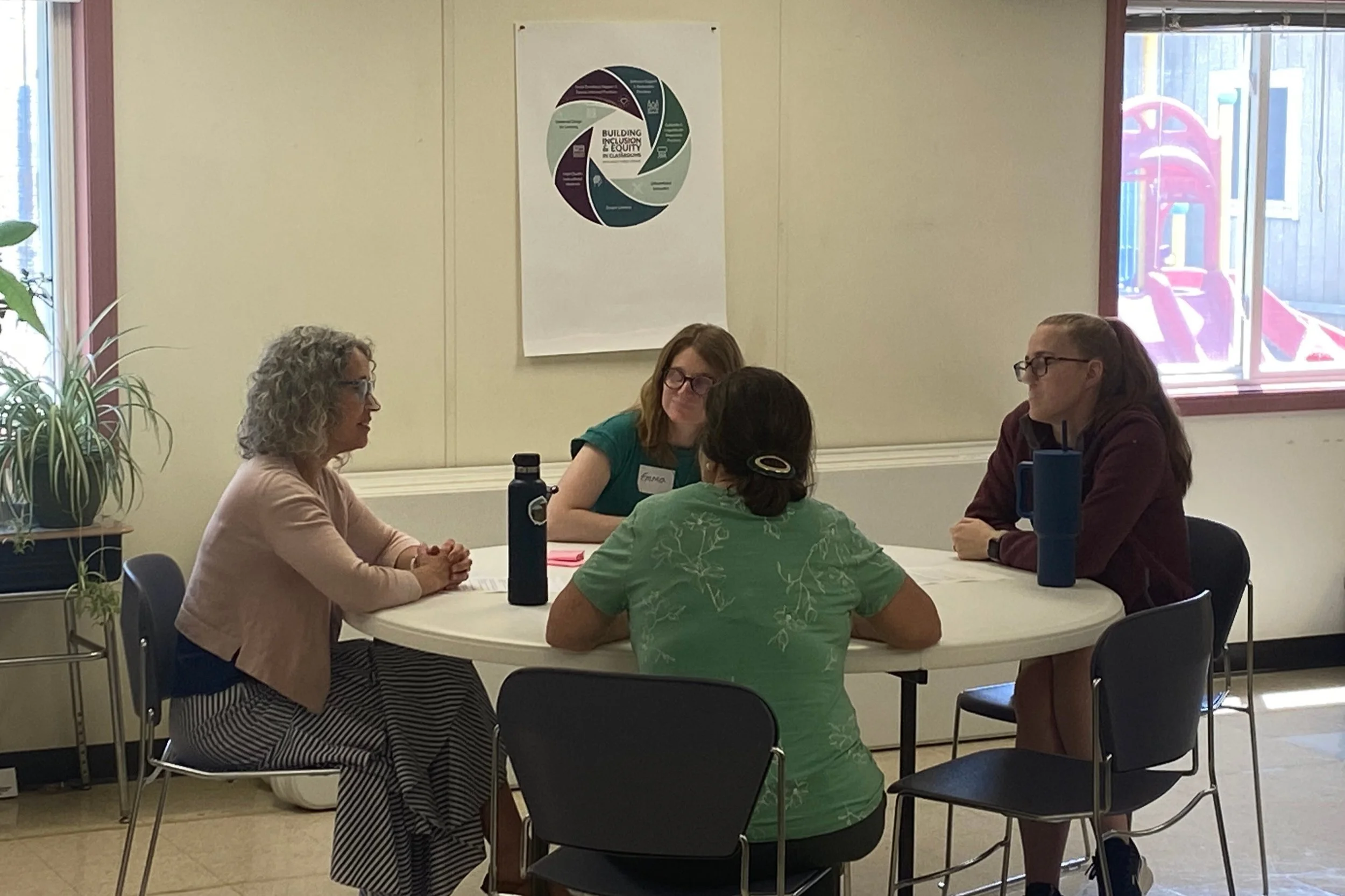 Four women sitting around a white round table in a room with a window and a poster on the wall.